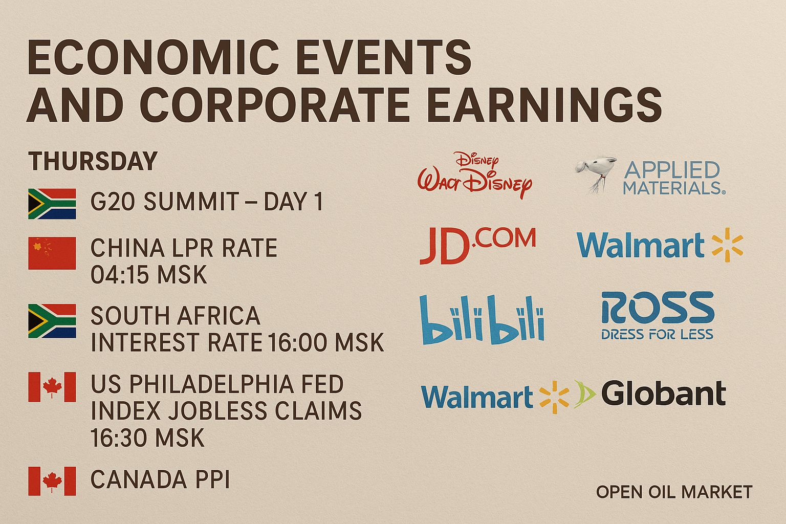 Detailed Review of Economic Events and Corporate Reporting for Thursday, November 20, 2025: G20 Summit, Interest Rate Decisions in China and South Africa, Key US Statistics and Canadian PPI, Reports from Disney, JD.com, Applied Materials, Walmart, Bilibili and Other Global Companies.